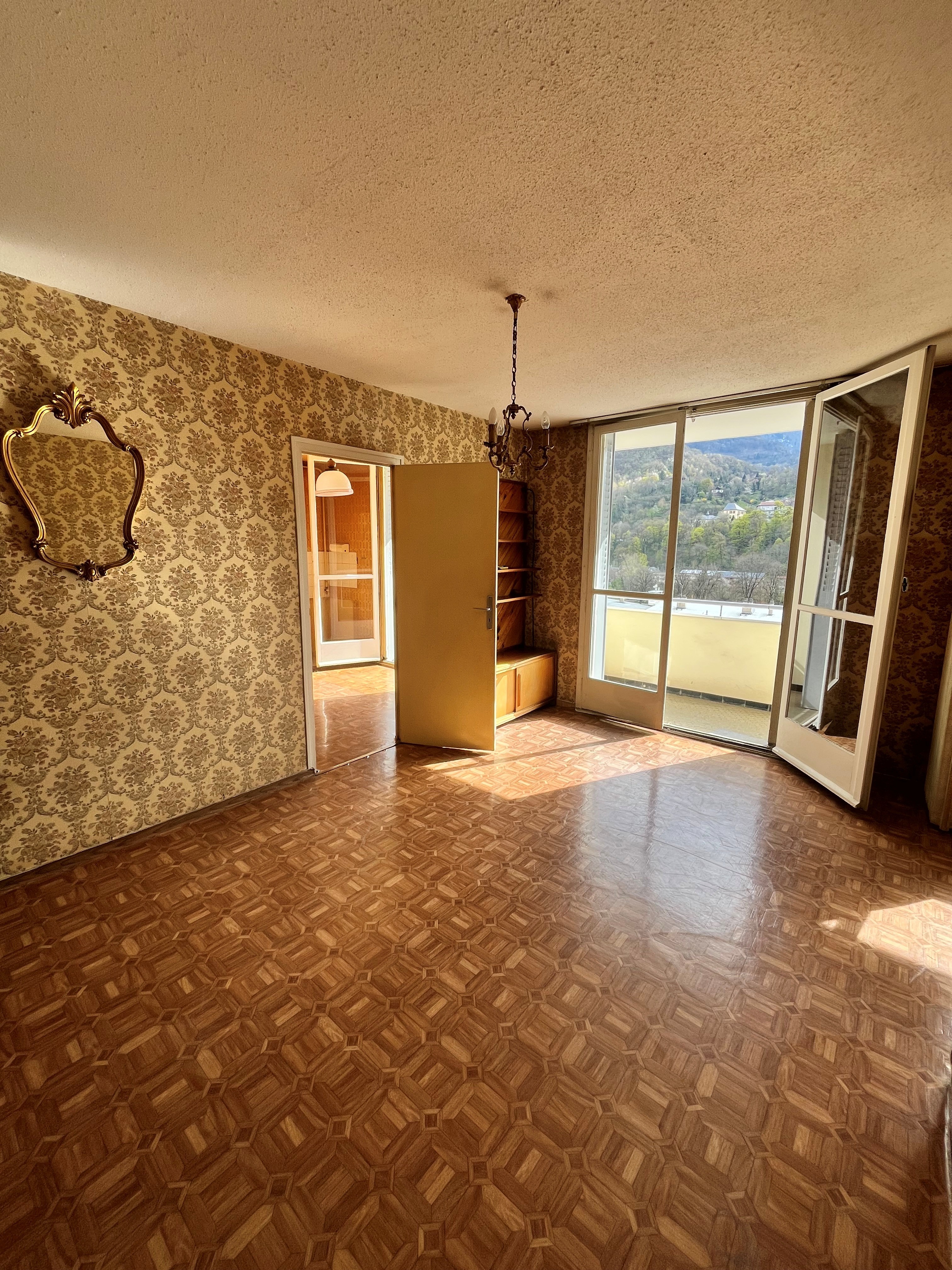 Salon-séjour avec accès au balcon qui offre une belle vue dégagée sur Conflans.