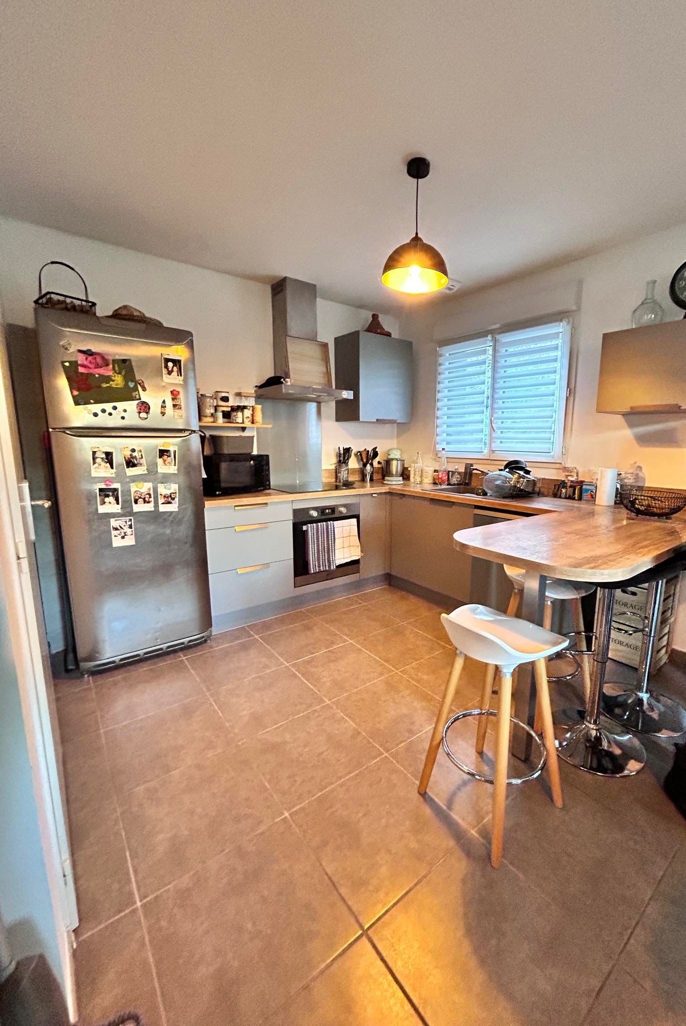 La pièce de vie spacieuse et lumineuse s’ouvre sur la terrasse et le jardin, tandis que la cuisine équipée est ouverte et dispose de son propre cellier attenant.